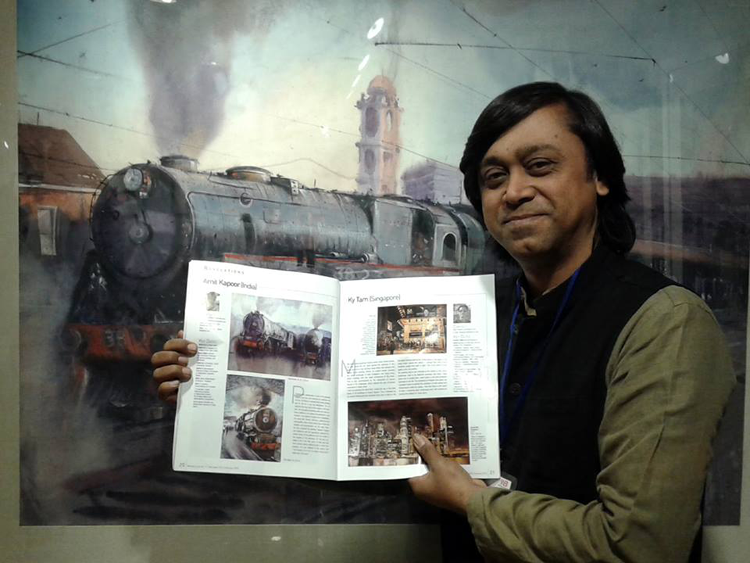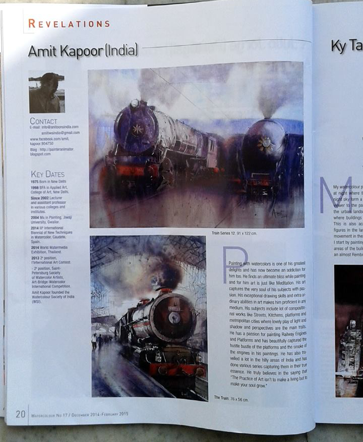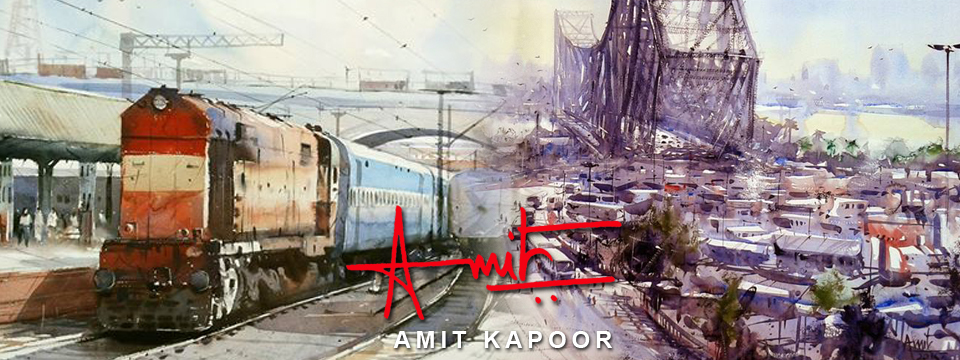 Mr. Amit kapoor is a leading master of watercolor medium in India. He has been recognized with top international honors for his paintings and his art graces the walls of many private and corporate collectors. Painting with Watercolors is one of his greatest delights and has now become an addiction for him too. He finds an ultimate bliss while painting and for him art is just like Meditation. His art captures the very soul of his subjects with passion. His exceptional drawing skills and extra ordinary abilities in art makes him proficient in any medium. His subjects include lot of compositional works like Streets, Kitchens, platforms and metropolitan cities where lovely play of light and shadow and perspectives are the main traits. He has a passion for painting Railway Engines and Platforms and has beautifully captured the hustle bustle of the platforms and the smoke of the engines in his paintings. He has also travelled a lot in the hilly areas of India and has done various series capturing them in their true essence. He truly believes in the saying that “The Practice of Art isn’t to make a living but to make your soul grow”.